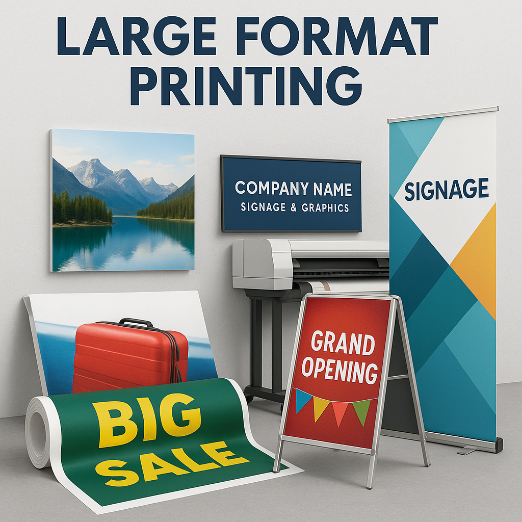 arge format banners are one of the most effective ways to get noticed. Perfect for storefronts, trade shows, outdoor events, and promotions, our banners are printed on durable materials that withstand weather while showcasing your message in vibrant, eye-catching colors. Available in a variety of sizes and finishes, they’re designed to make your brand stand out.